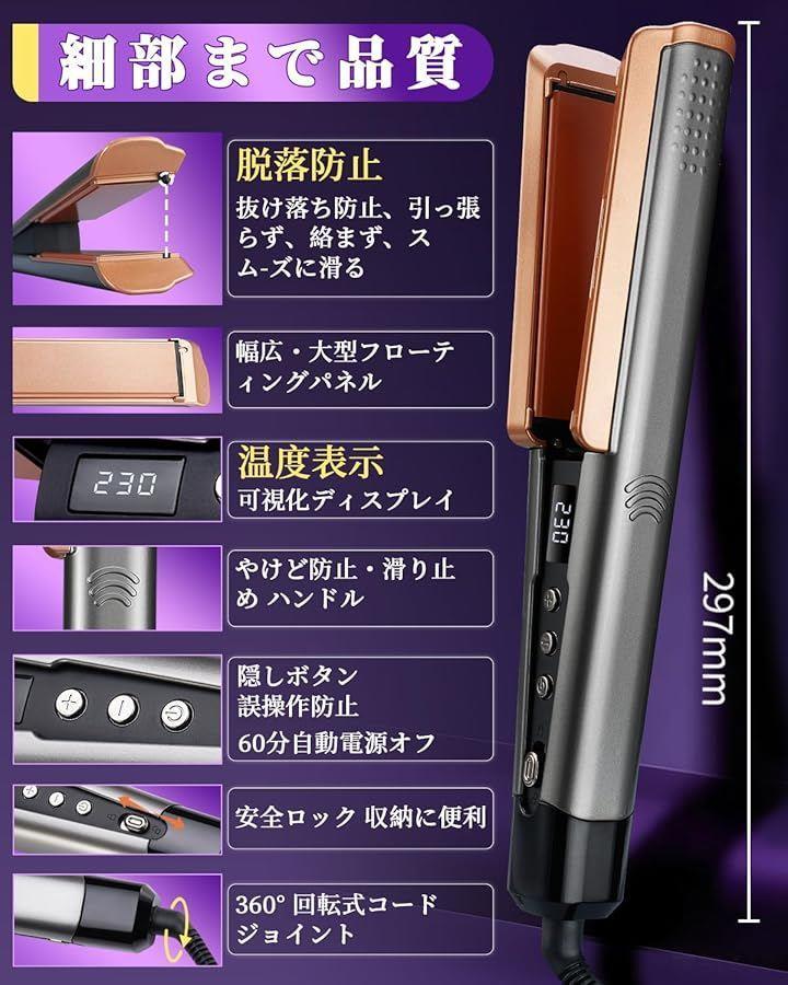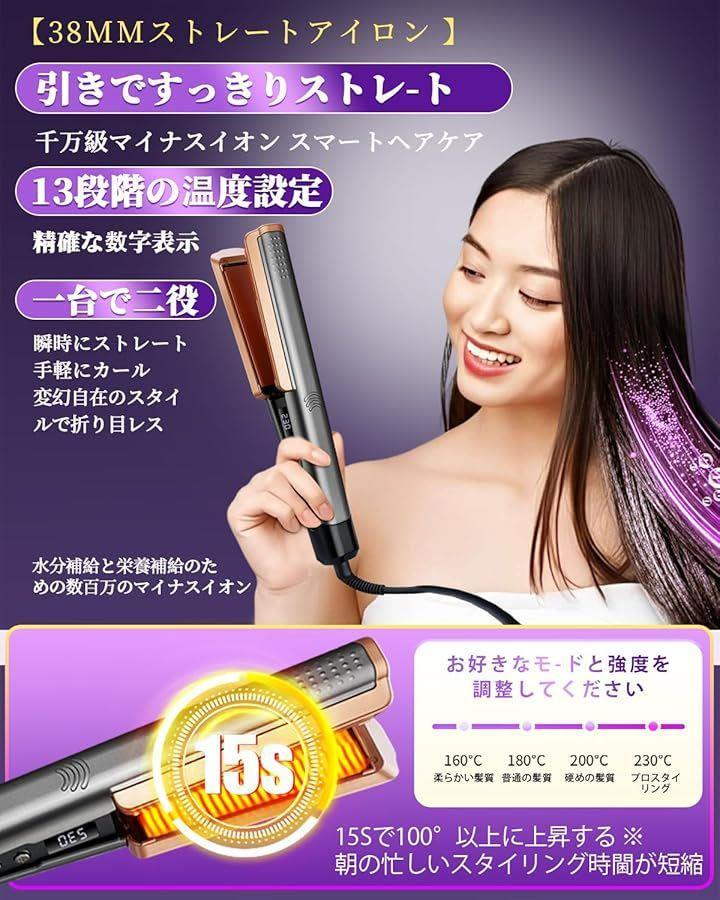 使いやすく、収納に便利:ヘアアイロンおすすめ 38mmの広めプレートでロングヘアも手早く処理。