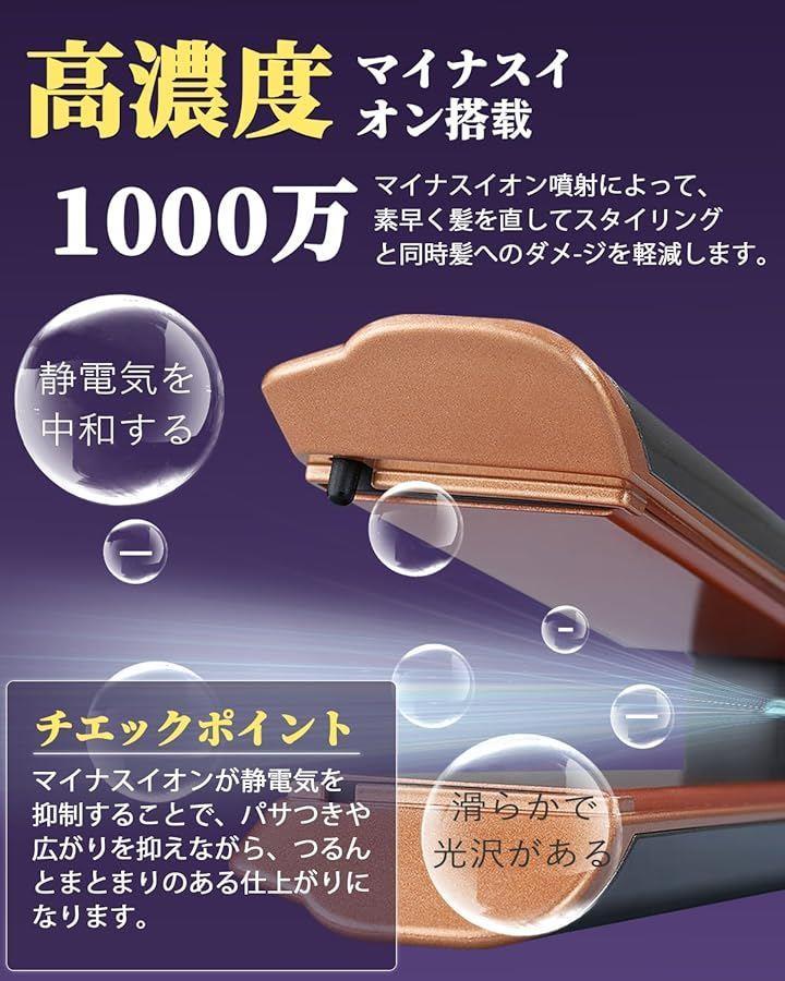 * 高濃度負イオン発生機能:この マイナスイオンヘアアイロン は、静電気による広がりやパサつきを大幅に抑制。