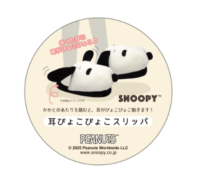 大人気キャラクター**スヌーピー**の耳がぴょこっと立ち上がる、遊び心たっぷりのスリッパが登場!歩くたびに耳が動く可愛らしいデザインで、おうち時間がもっと楽しくなります。JANコード:4548626260850