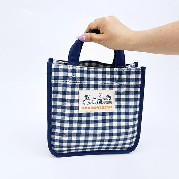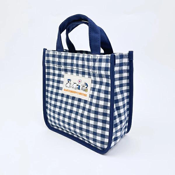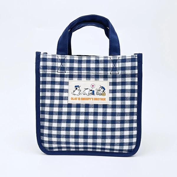 スヌーピーのきょうだい、オラフのランチトートです♪ネイビーチェックのシンプルデザイン♪ほのぼのしたオラフがとっても可愛い♪同シリーズで集めたくなっちゃう☆彡
