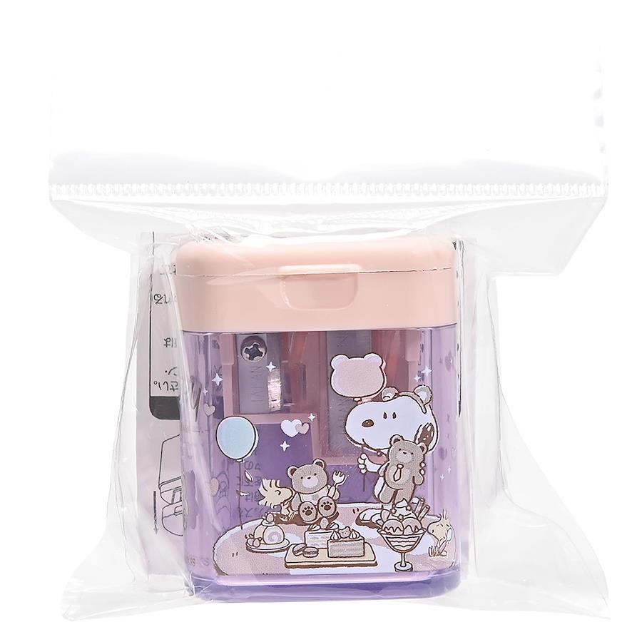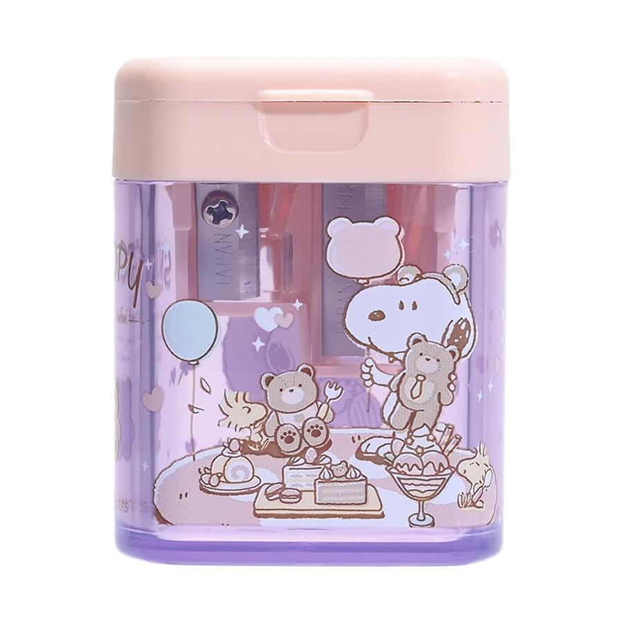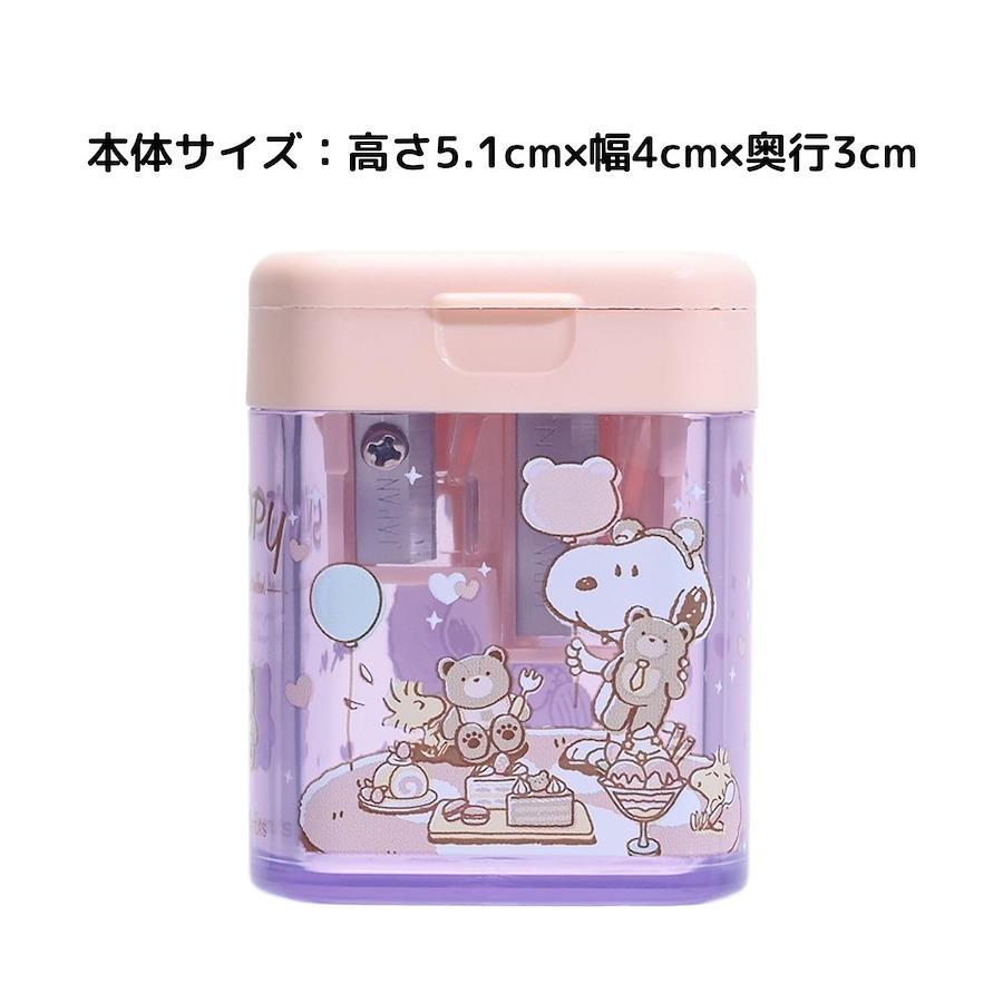 スヌーピーのデザインがかわいいミニ鉛筆削り角度の違う2種類の刃付きの小型鉛筆削り色鉛筆などのやわらかい芯も削れる2WAYタイプクズケースが大きく便利本体サイズ:高さ5.1cm×幅4cm×奥行3cm