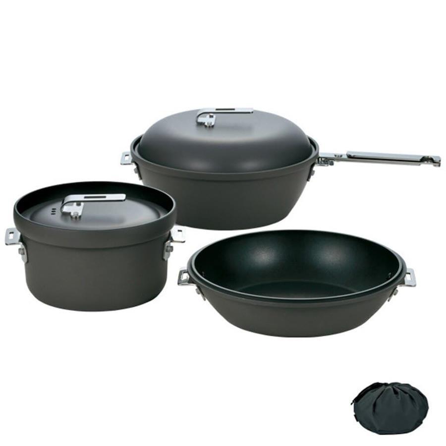 一台で焼く・炒める・煮る・揚げるの全てをこなすディープフライパン。 取り回しの良さを必要とする焼き料理に対応するシャローフライパン。 管理のしやすさで、ワンランク上の美味しさに炊き上げるライスクッカー。 様々なアウトドアレシピにマルチ対応する新野外クッカーセットのご提案です。