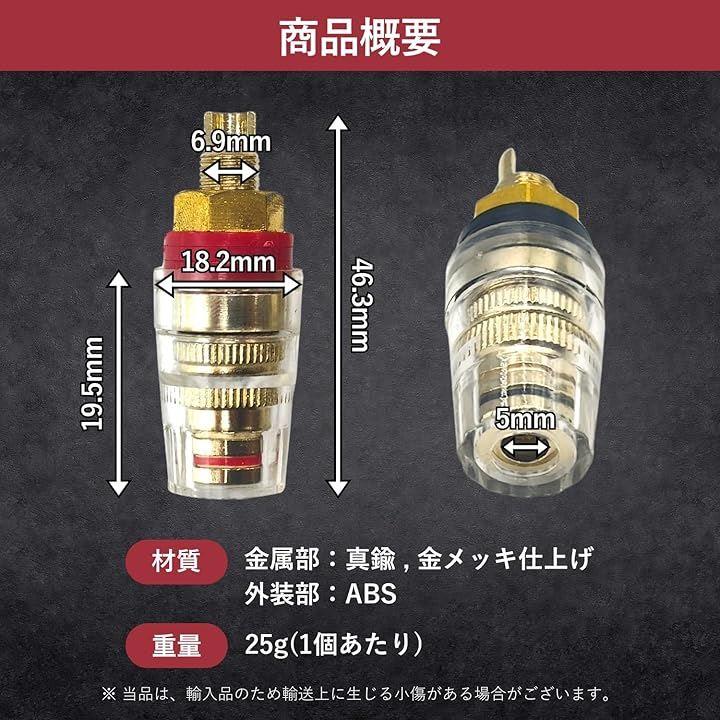 バリエーション: レッド(赤) 2個xブラック(黒) 2個 計4個セット、レッド(赤) 4個xブラック(黒) 4個 計8個セット サイズ: 全長 46.3mm、幅 18.2mm、バナナプラグ挿入部径:5mm