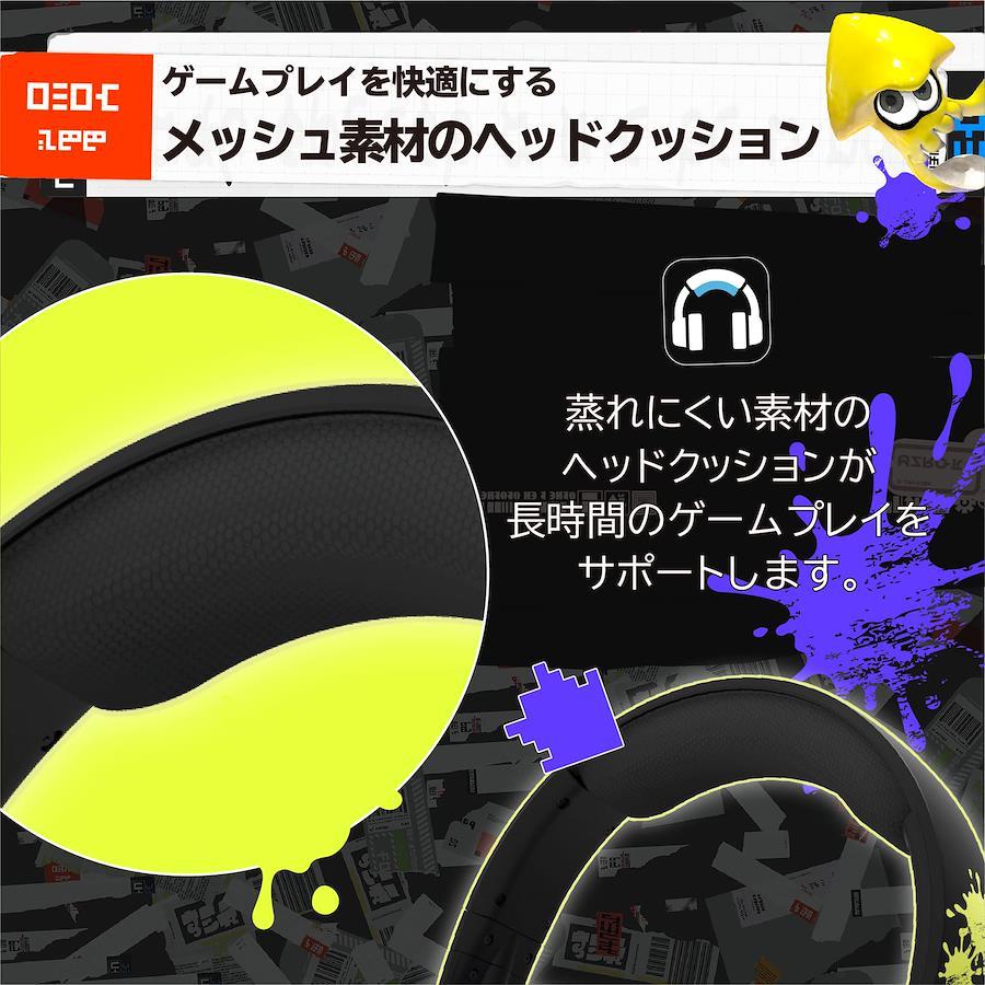・スプラトゥーン3のメインかラーとイカタコのポップなデザインのヘッドセットとなっております。・高音質40mmドライバー 40mmドライバー搭載で、幅広いゲームに最適なダイナミックで臨場感のある音質を再現します。・フレキシブルアームマイク マイク位置が調節しやすいフレキシブル仕様のマイクです。・耳元に集約された操作部 イヤーカップ背面に音量調節機能、マイクON/OFF切り替え機能を集約。耳元で素早く操作することができます。・長時間の使用をサポート 蒸れにくいメッシュ素材のヘッドクッションで長時間のゲームプレイをサポートします。・遮音性の高いオーバーイヤータイプのイヤーパッド 遮音性が高く、しっかりとした装着感のオーバーイヤータイプのイヤーパッドを搭載しています。