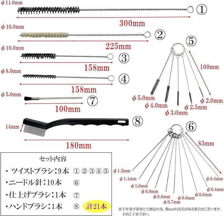 「セット内容 / ハンドブラシ:1本 / 仕上げブラシ:1本 / ツイストブラシ:9本 / ニードル針:10本」