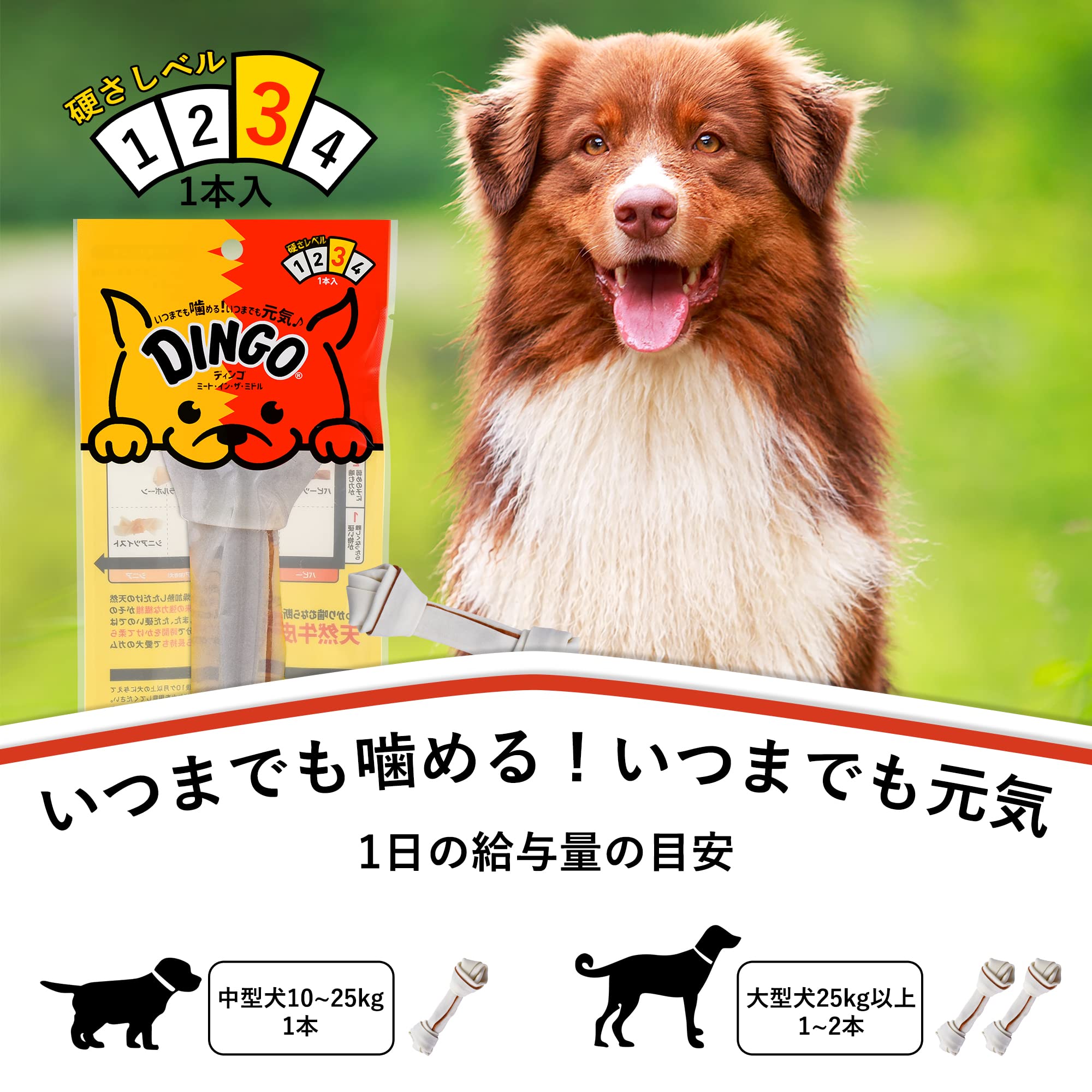 牛皮の内側に肉が巻き込まれているので、愛犬が飽きずに食べ続け、おいしさ長持ち!よく噛むことで歯を汚れを落とし、ストレス解消やイタズラ噛み防止に役立ちます。牛皮の内側に肉が巻き込まれているので、愛犬が飽きずに食べ続け、おいしさ長持ち。よく噛むことで歯を汚れを落とし、ストレス解消やイタズラ噛み防止に役立ちます。農林水産省認定工場で製造しています。