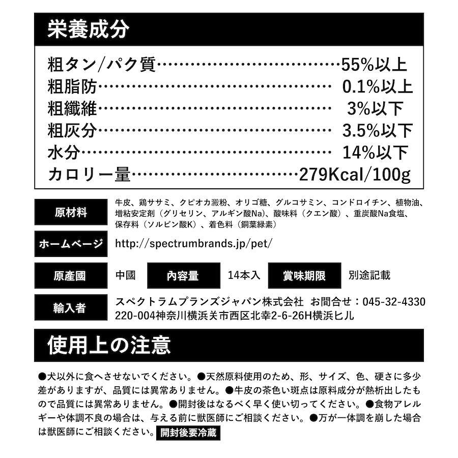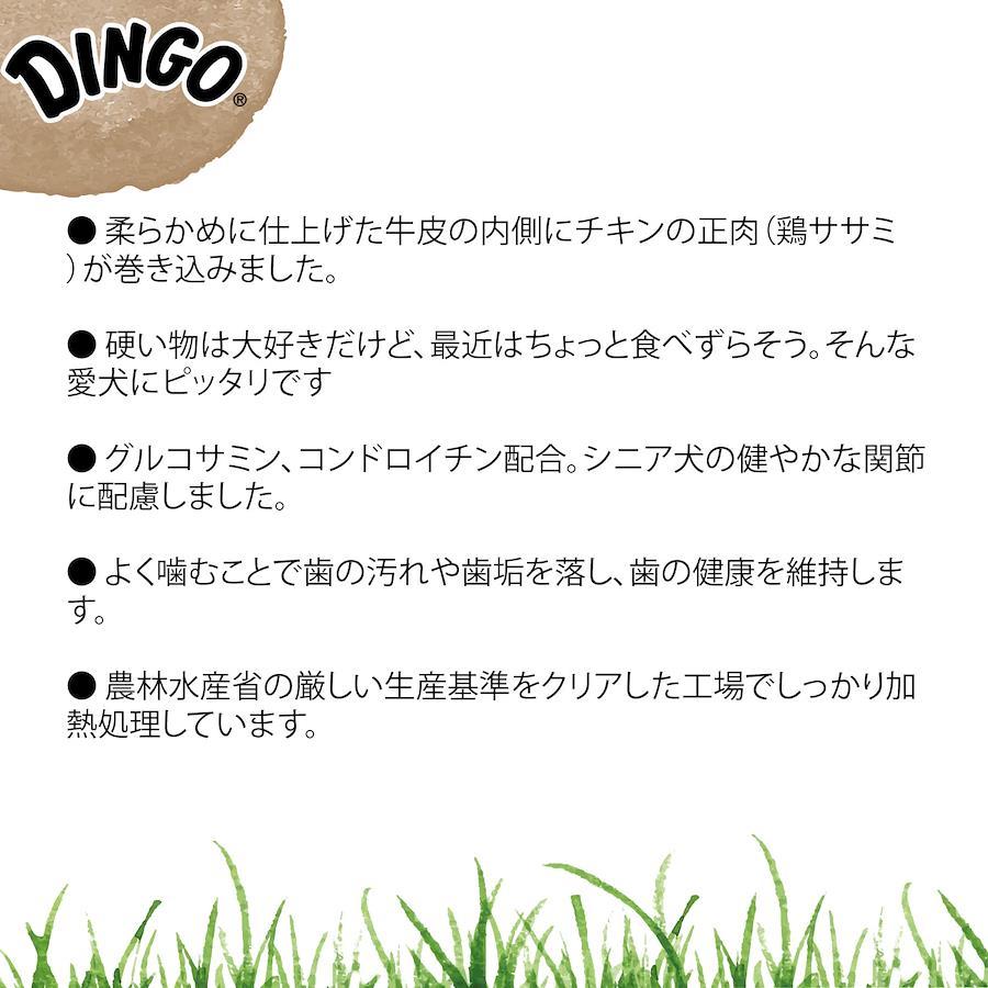 柔らかめに仕上げた牛皮の内側にチキンの正肉(鶏ササミ)が巻き込みました。硬い物は大好きだけど、最近はちょっと食べずらそう。そんな愛犬にピッタリです。グルコサミン、コンドロイチン配合。シニア犬の健やかな関節に配慮しました。ミネラルパウダー、クロロフィル配合。よく噛むことで歯の汚れや歯垢を落し、歯の健康を維持します。農林水産省の厳しい生産基準をクリアした工場でしっかり加熱処理しています。