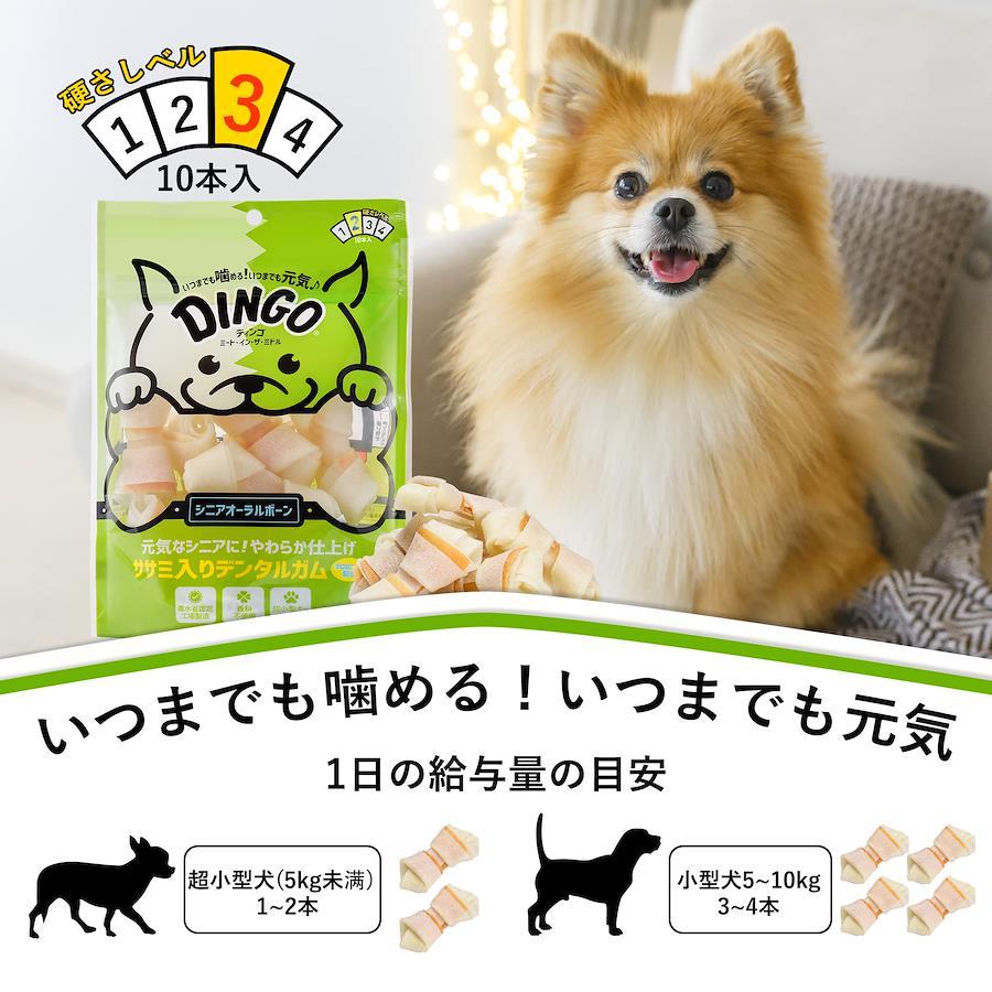 1日の給与量の目安は超小型犬(5kg未満)1~2本、小型犬(5kg~10kg)3~4本、永久歯の生えた生後10ケ月以上の犬に与えてください。そばに新鮮な水を用意してください。丸呑みして喉に詰まらないよう注意しながら与えてください。