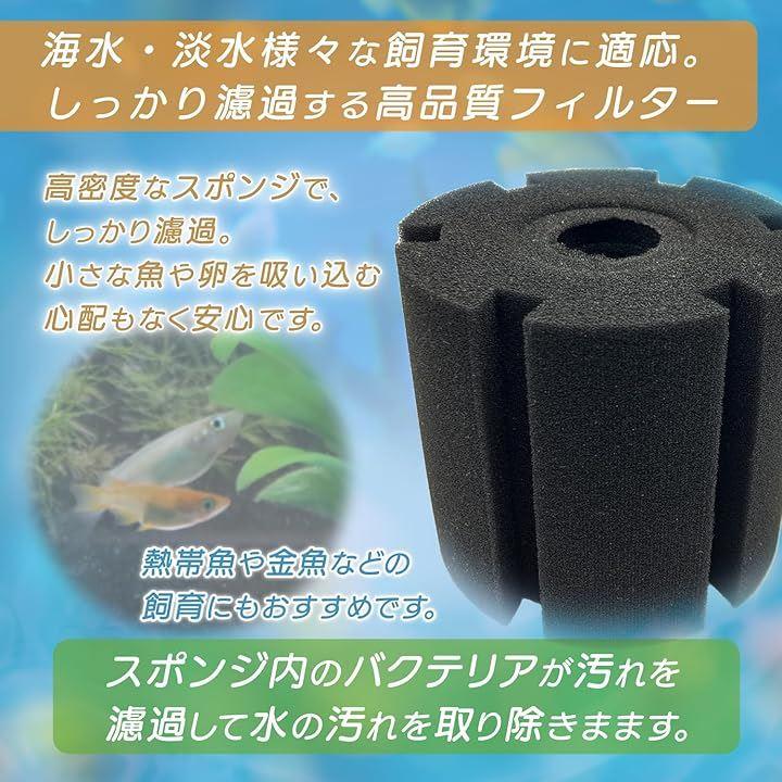 「濾過能力の高い高品質フィルター」淡水、海水、鑑賞用、食用飼育にいたるまで幅広い分野でご使用いただける濾過能力と水の循環に優れたスポンジフィルターです。