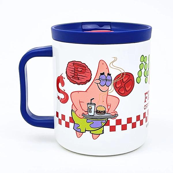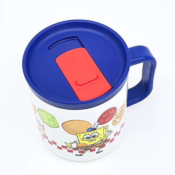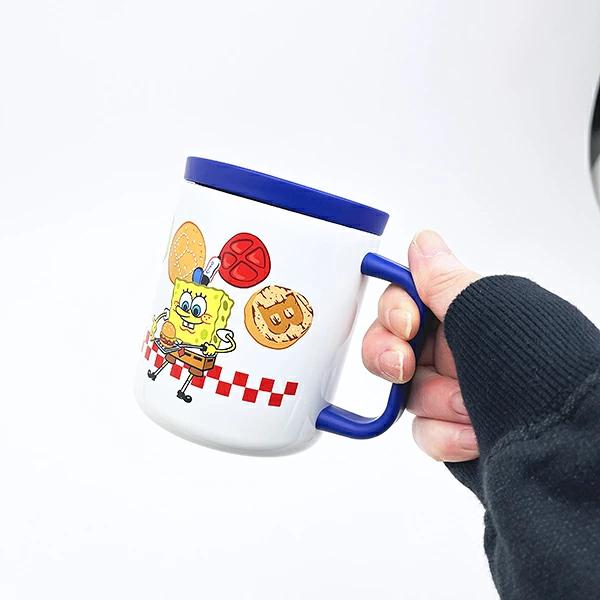 スポンジボブのフタ付きマグカップです。フタをしたまま飲むことも可能でとっても便利♪飲み物の適温を保ちやすい保冷保温効果もうれしいポイントです☆彡