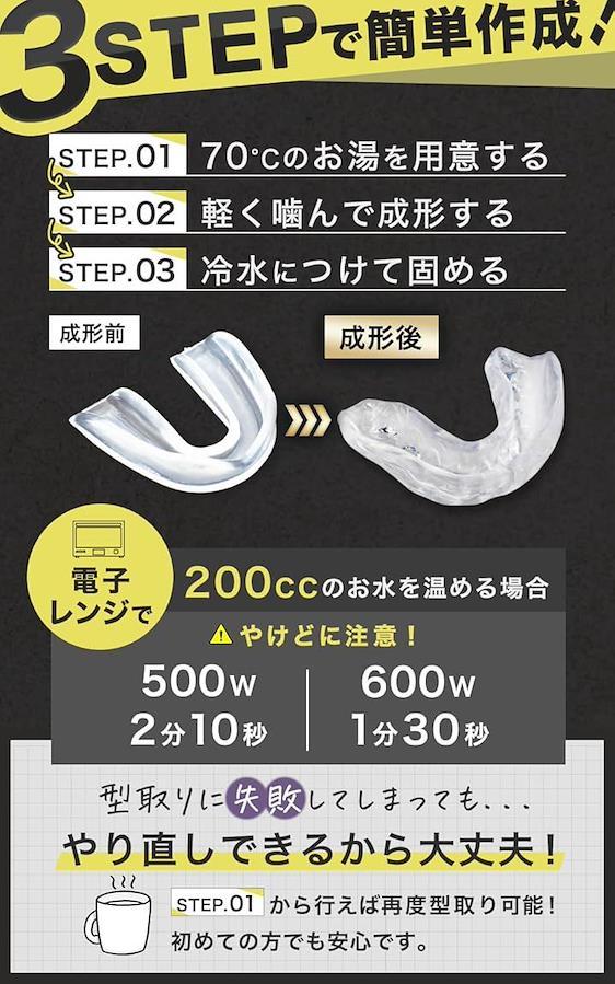 3ステップの簡単成型で、あなたの歯にぴったりフィットします。
