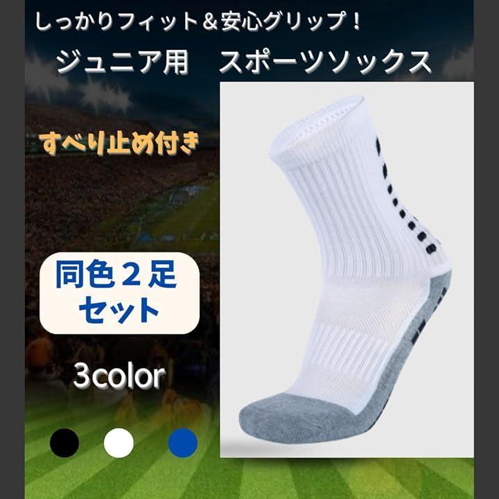 「しっかりフィット&安心グリップ。ジュニア用 すべり止め付きスポーツソックス」運動中の足元をしっかりサポート。すべり止め付きで安心して動き回れる、ジュニア用スポーツソックスです。
