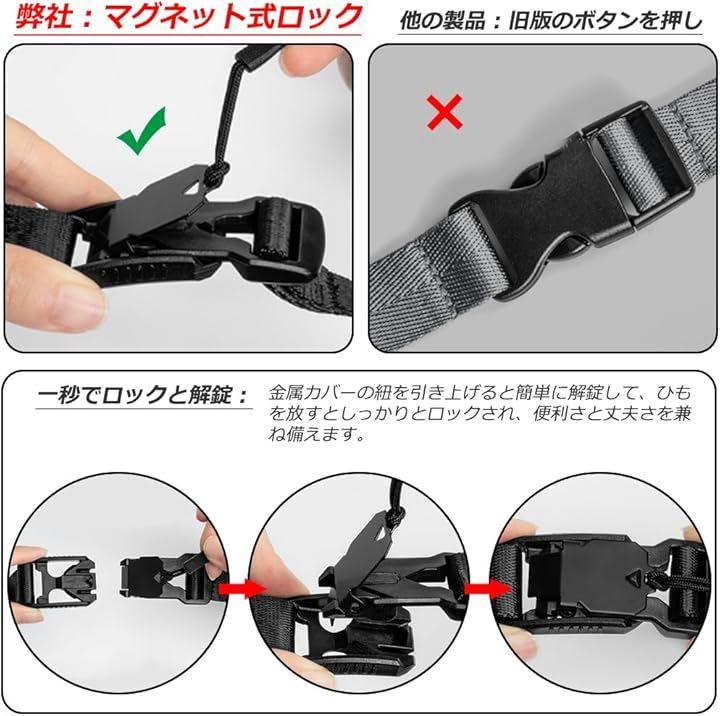 そして、本社のショルダーストラップは金属製のマグネット式バックルを採用し、金属カバーの紐を引き上げると簡単に解錠して、ひもを放すとしっかりとロックされ、便利さと丈夫さを兼ね備えます。