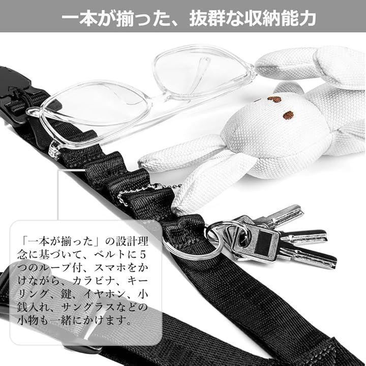 「抜群な収納能力、両手を解放」:「一本が揃った」の設計理念に基づいて、ベルトに5つのループ付、スマホをかけながら、カラビナ、キーリング、鍵、イヤホン、小銭入れ、サングラスなどの小物も一緒にかけます。