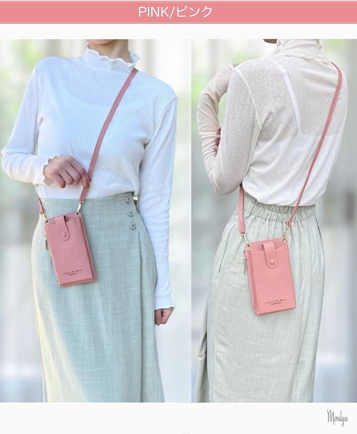 「仕様・サイズ」 カード入れx5・スマホポケットx1・ファスナーポケットx1 (サイズ)縦17.5cm 横10cm マチ2cm ショルダーベルト65-125cm(*ご使用のスマホケースにより収納できない場合もございますのでご注意ください。