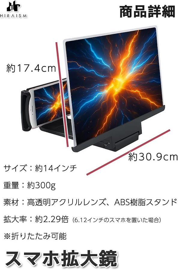「商品詳細」スマホ拡大鏡 サイズ:約14インチ、重量:約300g、素材:高透明アクリルレンズ、ABS樹脂スタンド、折りたたみ可能