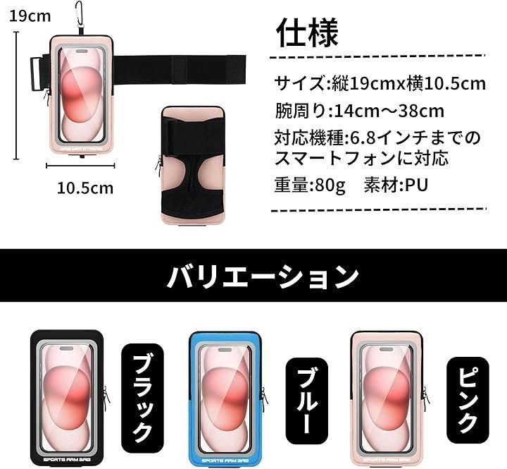 「商品スペック」サイズ:縦19cmx横10.5cm、腕周り:14cm~38cm、対応機種:6.8インチまでのスマートフォンに対応、重量:80g、素材:PU、カラー:ブラック/ピンク/ブルー