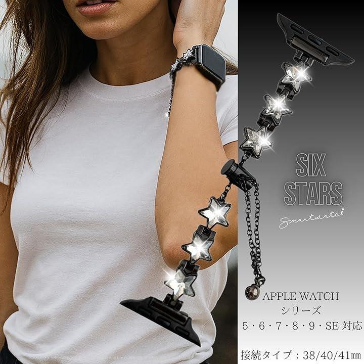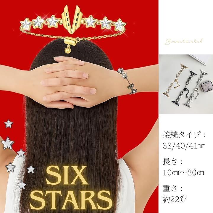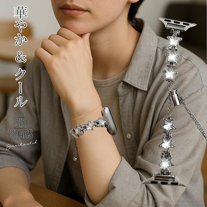 「星の輝きがアクセント。華やかでクールなデザイン」 バンド全体にあしらわれた6つのキラキラ輝く星のモチーフが、手元にさりげない個性を与えます。