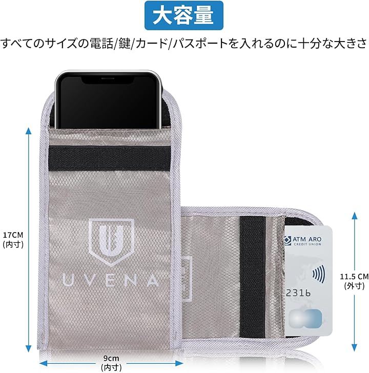 「スマートキー・ICカードをまとめて守る」RFID/NFC対応の電波遮断機能を搭載し、スマートキー、スマホ、クレジットカード、ICカードなどを1つに収納可能。