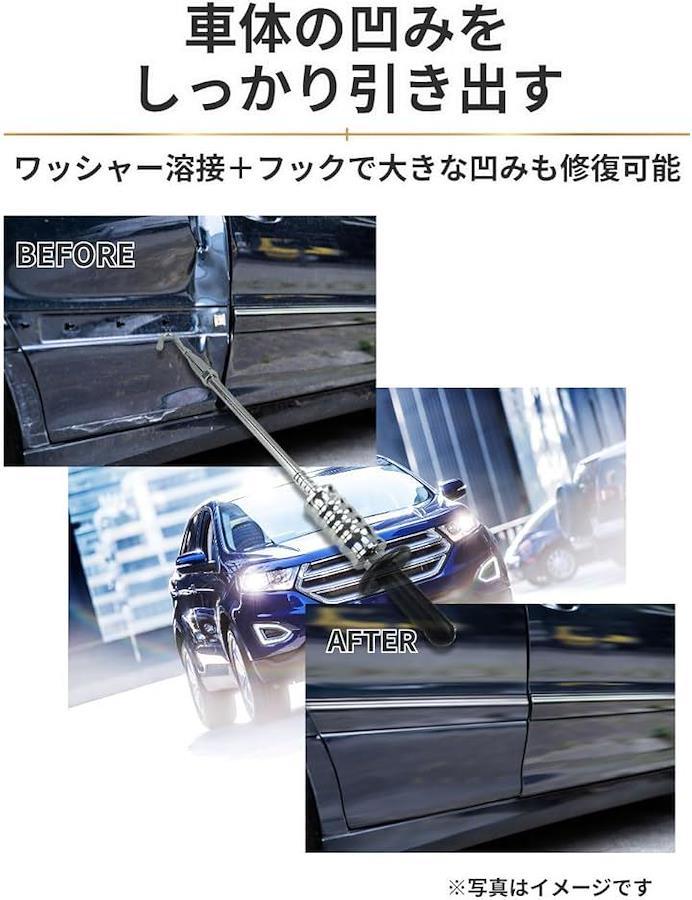 「車体のへこみ修復やハブ脱着など幅広い用途に対応」自動車のボディ修理では、ワッシャーを溶接してからフックで引っ張ることで、大きな凹みも整えることができます。