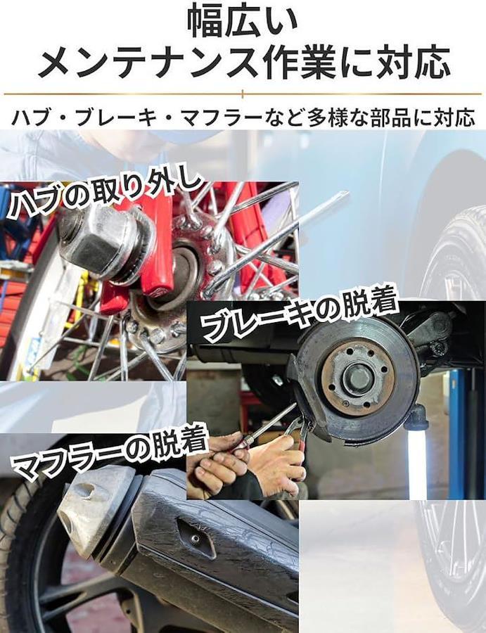 また、圧入されたハブベアリングの取り外しや、ドラムブレーキ、オートバイのマフラー部品の脱着にも適しており、スライドハンマー1本で様々な場面に対応可能です。