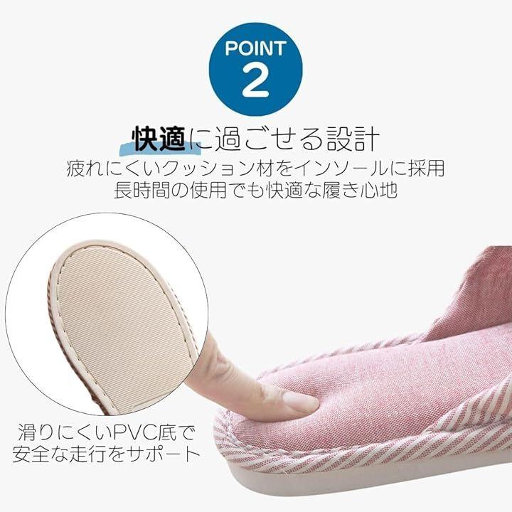 「疲れ知らずのクッションと滑り止め機能」疲れにくいクッション材をインソールに採用したスリッパで、長時間の使用でも快適な履き心地。