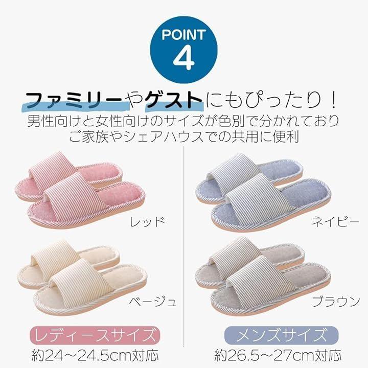 「セット内容」メンズサイズ2足、レディースサイズ2足 「サイズ」(メンズサイズ)約26.5~27cm (レディースサイズ)約24~24.5cm 「カラー」(メンズサイズ)ネイビー、ブラウン (レディースサイズ)レッド、ベージュ