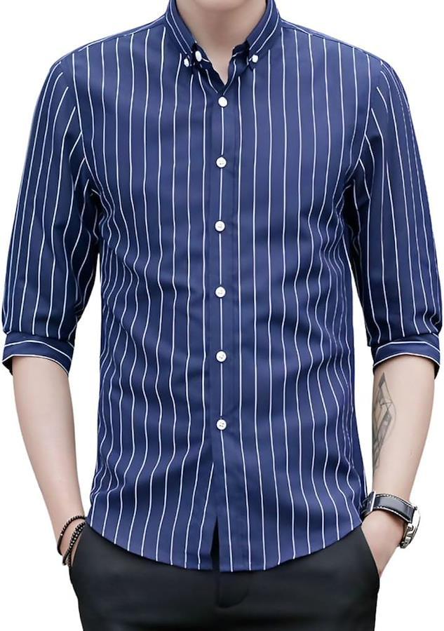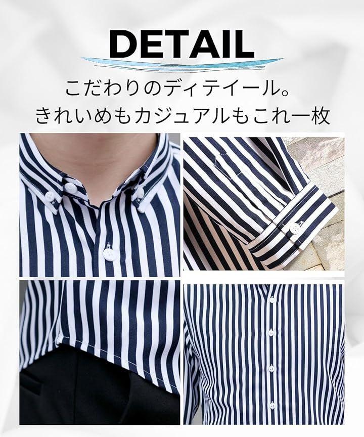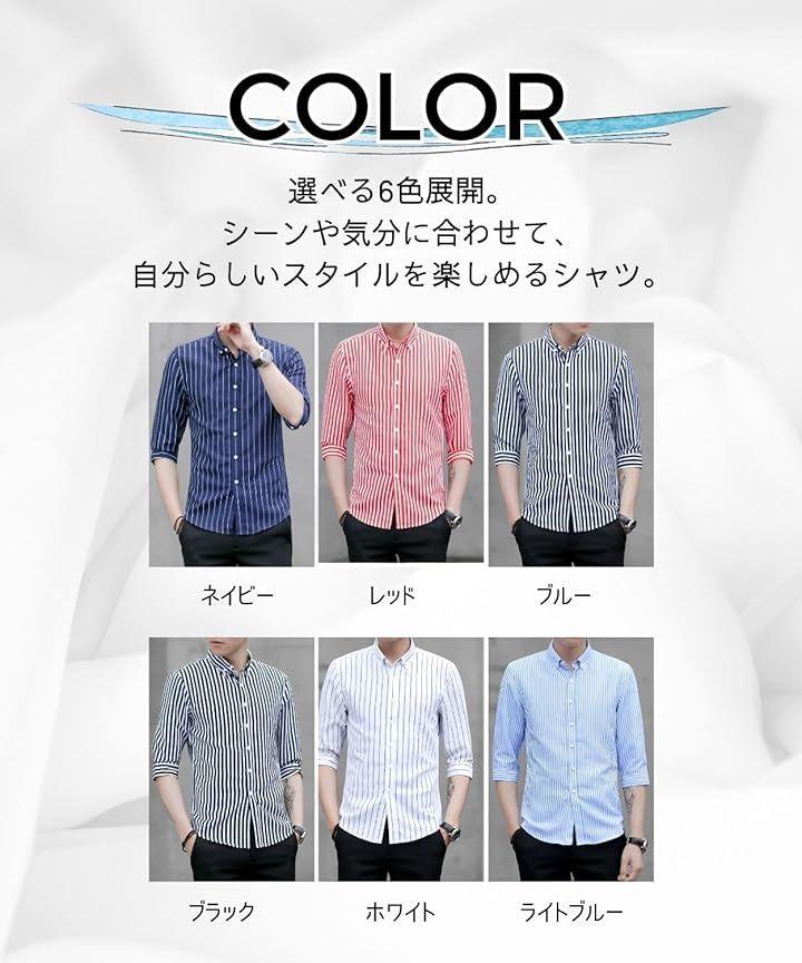 スリムシルエット ストライプ シャツ メンズ 7分袖 七分袖 襟付きシャツ ボタンダウン ポリエステル ノンアイロン 薄手 ポケット