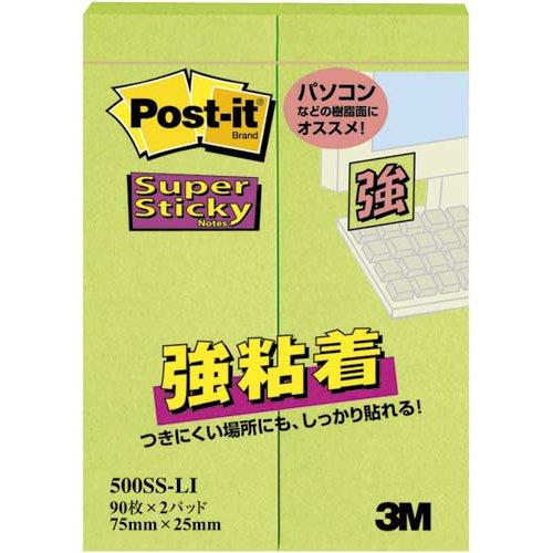 今までつきにくかった、パソコンのデスクトップやキャビネットなどの樹脂面や垂直面にもしっかり貼れる強粘着タイプ。粘着力は従来品の約2倍でも、はがす時はきれいにはがせます。しっかり目立つネオンカラー。●寸法/75×25mm●カラー/ライム●1冊/90枚●単位(入数)/1セット(6冊入)●メーカー品番/500SS-LI×3