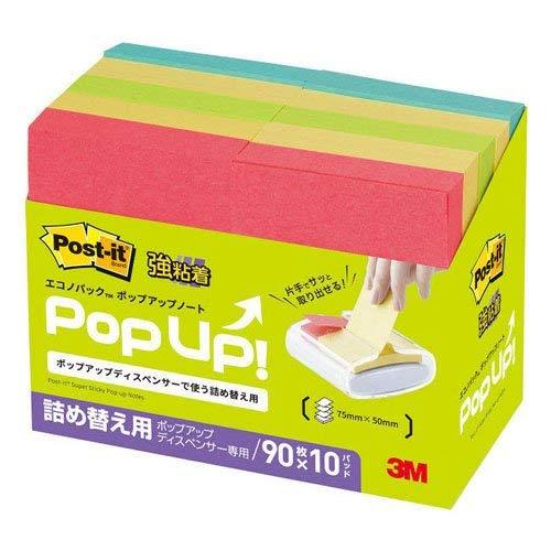 ポップアップディスペンサーで使う詰め替え用付箋。※ディスペンサーは別売です。75×50mm。90枚×10パッド。イエロー4冊、アクアウェーブ、ライム、ポピー各2冊。