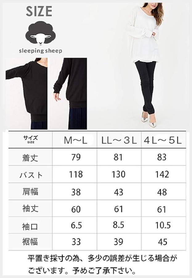 [LL~3L] 着丈:約81cm、バスト:約130cm、肩幅:約43cm、袖丈:約61cm、袖口:約8.5cm、裾幅:約39cm