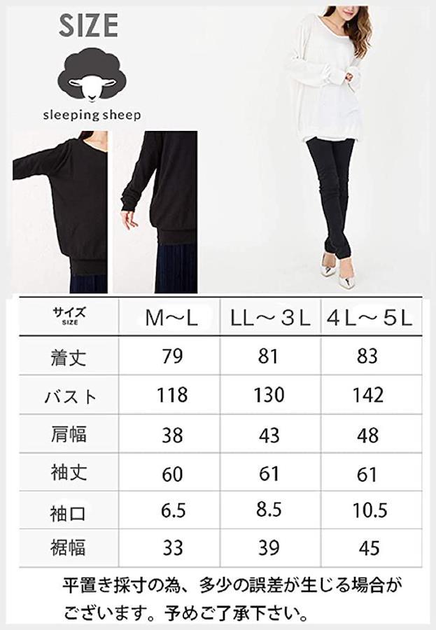・[M~L] 着丈:約79cm、バスト:約118cm、肩幅:約38cm、袖丈:約60cm、袖口:約6.5cm、裾幅:約33cm [LL~3L] 着丈:約81cm、バスト:約130cm、肩幅:約43cm、袖丈:約61cm、袖口:約8.5cm、裾幅:約39cm [4L~5L] 着丈:約83cm、バスト:約142cm 肩幅:約48cm 袖丈:約61cm、袖口:約10.5cm、裾幅:約45cm