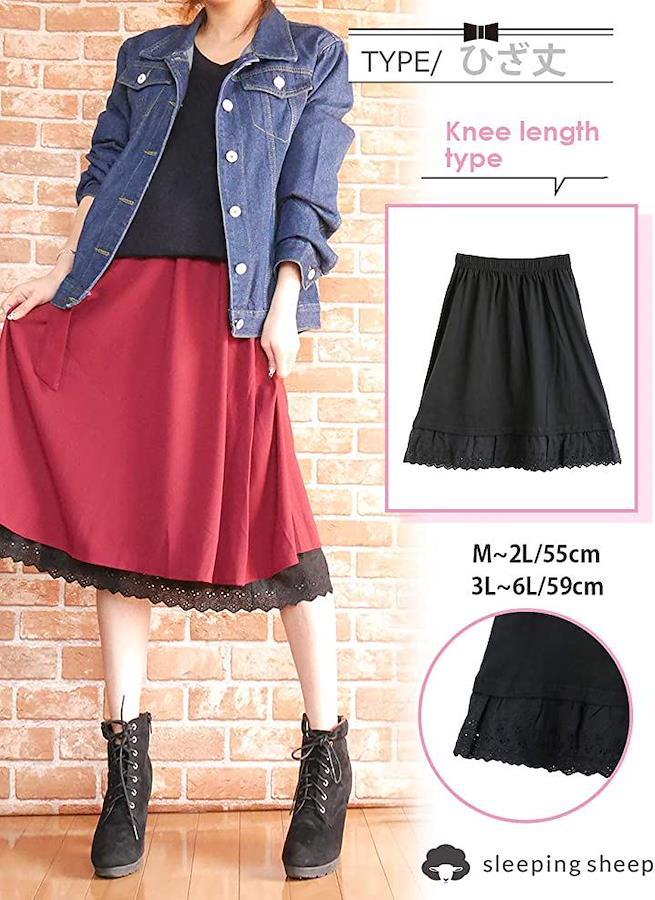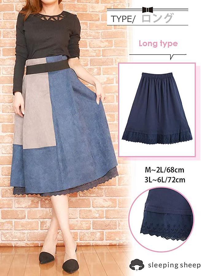 ・「カラー」:ブラック ネイビー、生成り「素材構成」:コットン100% 「サイズ」 *ショート丈 M~2L ウエスト30-50cm 着丈43cm 裾幅55cm レース幅8cm 3L~6L ウエスト35-60cm 着丈47cm 裾幅60cm レース幅8cm *ひざ丈 M~2L ウエスト30-50cm 着丈55cm 裾幅63cm レース幅8cm 3L~6L ウエスト35-60cm 着丈59cm 裾幅68cm レース幅8cm *ロング丈 M~2L ウエスト30-50cm 着丈68cm 裾幅67cm レース幅8cm 3L~6L ウエスト35-60cm 着丈72cm 裾幅72cm レース幅8cm