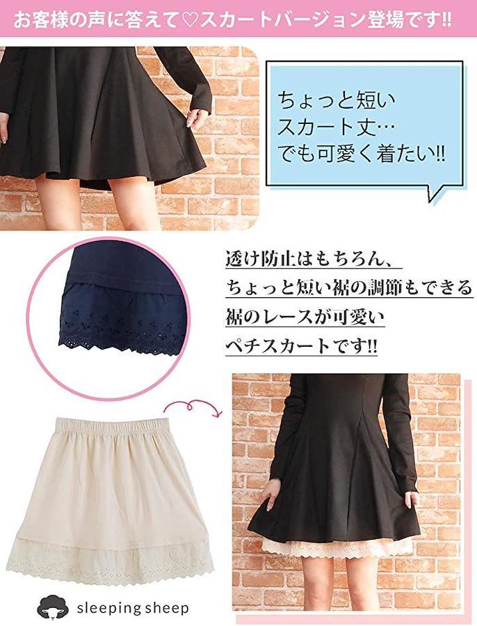 スカートの透け感防止や着丈の長さUPに便利なペチスカートのご紹介です* 当店販売の人気商品、ペチパンツのスカートバージョンが欲しいというお客様の声にお応えして、ついに登場です..・可愛いデザインなのに透けちゃう…前に買ったワンピースだけどちょっと着丈が短い… そんな時に便利なのがペチスカート..裾がレースになっているから見えても可愛く、長さやデザインのアレンジにもぴったりのアイテムです*・柔らかな着心地でごわつかないからストレスフリー。ウエストは良く伸びるゴム仕様なので 苦しさもなく、楽ちんにご着用頂けます。
