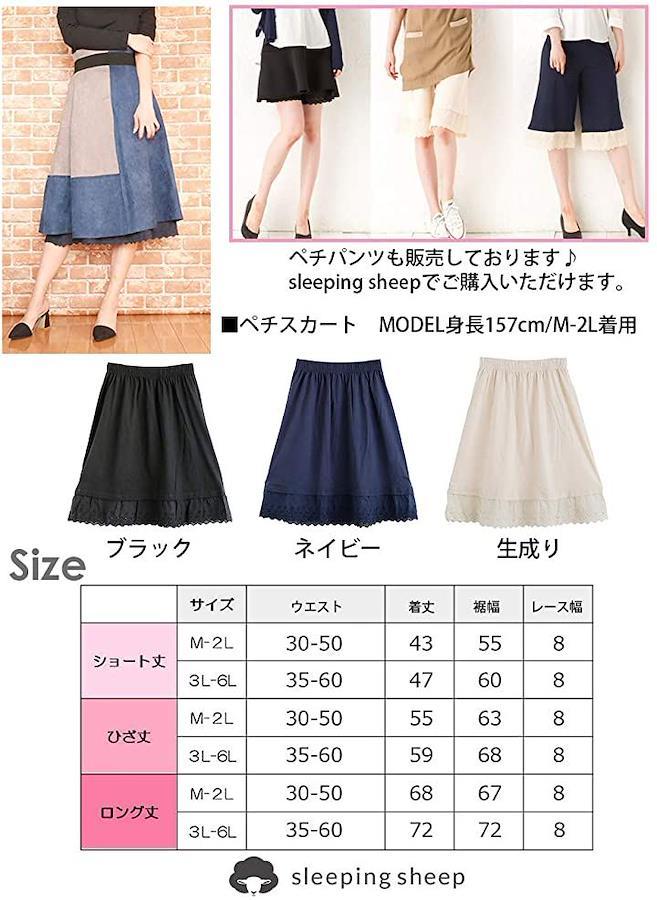 ・「カラー」:ブラック ネイビー、生成り「素材構成」:コットン100% 「サイズ」 *ショート丈 M~2L ウエスト30-50cm 着丈43cm 裾幅55cm レース幅8cm 3L~6L ウエスト35-60cm 着丈47cm 裾幅60cm レース幅8cm *ひざ丈 M~2L ウエスト30-50cm 着丈55cm 裾幅63cm レース幅8cm 3L~6L ウエスト35-60cm 着丈59cm 裾幅68cm レース幅8cm *ロング丈 M~2L ウエスト30-50cm 着丈68cm 裾幅67cm レース幅8cm 3L~6L ウエスト35-60cm 着丈72cm 裾幅72cm レース幅8cm