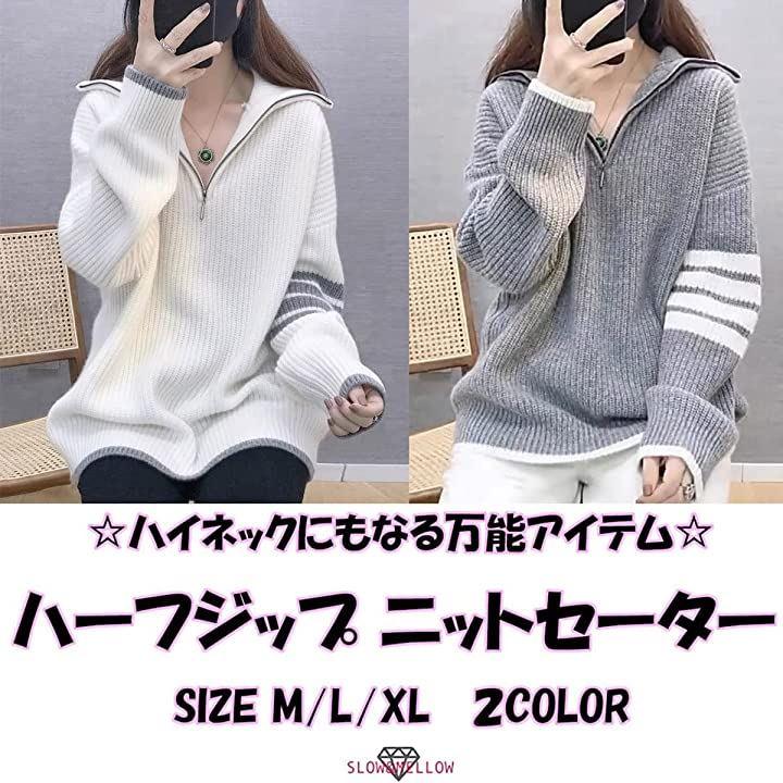 ・メイン素材: ポリエステル・素材構成: 100% ポリエステル・ハーフジップのニットセーターです♡ファスナーを上まで閉めるとハイネックになり首元の防寒が出来るお洒落で便利なアイテム・・腕・袖口と裾のラインがアクセントになっていてお洒落で可愛い・さりげないアシンメトリーデザインがGOOD♥・秋から春先までロングシーズン使える1枚・全体的にゆったりとしたシルエットで体型カバーも出来ます。