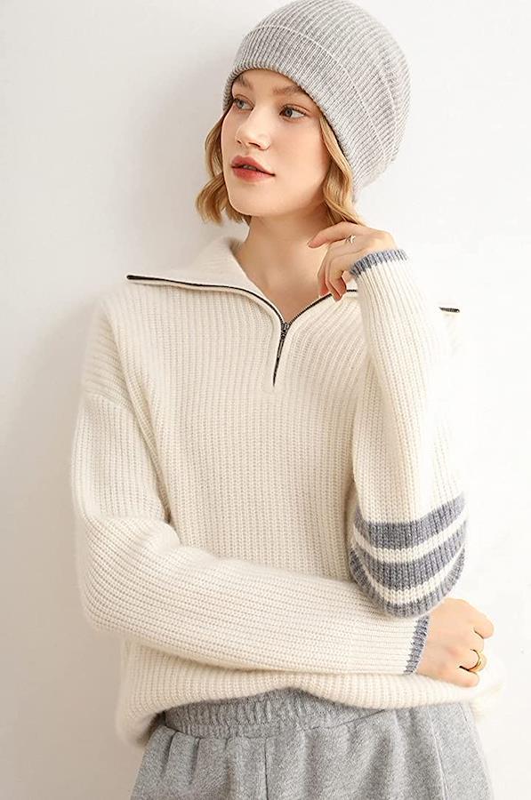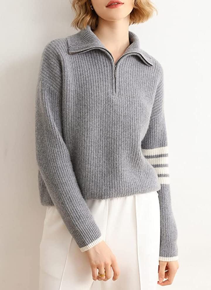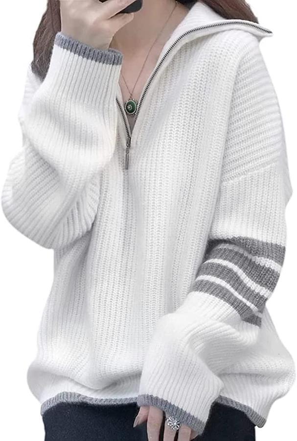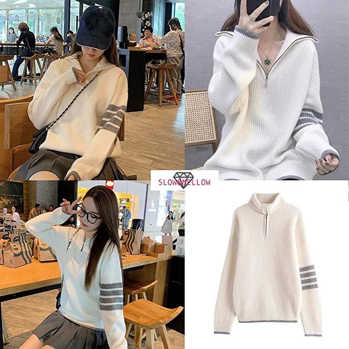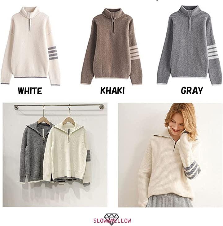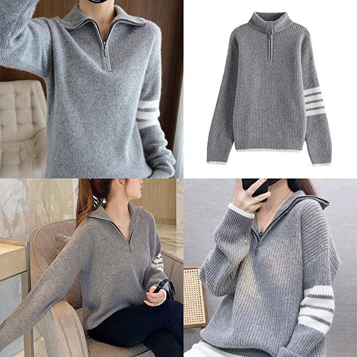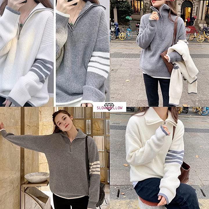 ・メイン素材: ポリエステル・素材構成: 100% ポリエステル・ハーフジップのニットセーターです♡ファスナーを上まで閉めるとハイネックになり首元の防寒が出来るお洒落で便利なアイテム・・腕・袖口と裾のラインがアクセントになっていてお洒落で可愛い・さりげないアシンメトリーデザインがGOOD♥・秋から春先までロングシーズン使える1枚・全体的にゆったりとしたシルエットで体型カバーも出来ます。