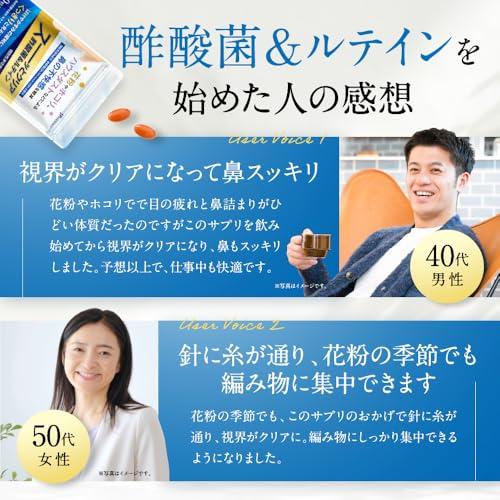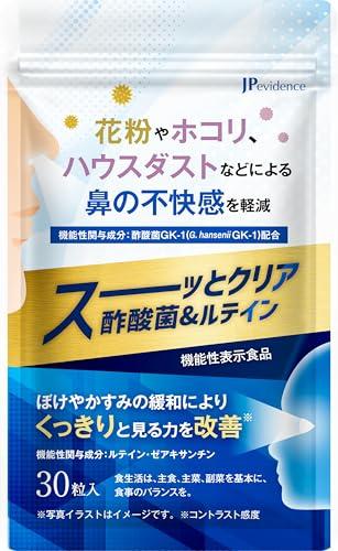 スーッとクリア酢酸菌&ルテイン 花粉 ホコリ ハウスダストなどによる鼻の不快感を軽減。ぼけやかすみの緩和によりくっきりと見る力を改善 ルテイン ゼアキサンチン ?機能性表示食品 「酢酸菌」×「ルテイン」のアイケア・免疫対策サプリ。 ※健康な人の免疫機能に役立つこと。 ?花粉 、ホコリ、ハウスダストによる鼻の不快感を軽減する ぼけやかすみの緩和によりくっきりと見る力を改善する ※本品は花粉症薬ではございません。機能性表示食品です。 ?商品特長:花粉、ホコリ、ハウスダスト等による鼻の不快感を軽減する。 健康な人の免疫機能の維持に役立つ。 目の黄斑部の色素量を増やし、紫外線やブルーライト光などの光ストレスから保護する コントラスト感度(ぼやけやかすみの緩和によりくっきり見る力)を改善する 機能性表示食品。安全・安心のアレルゲンフリー処方。 ?こんな方にオススメ:花粉やホコリ・ハウスダスト等による不快な鼻グズにお悩みの方、免疫を維持し健康でいたい方、目の疲れを感じる方、ぼやける方。副作用の無い安全な商品が必要な方、刺激に敏感な方