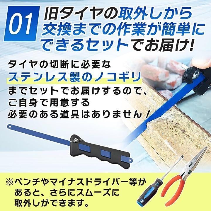 タイヤの切断に必要なステンレス製のノコギリもセットでお届けするので、初心者でも道具の用意不要で簡単な交換が可能。