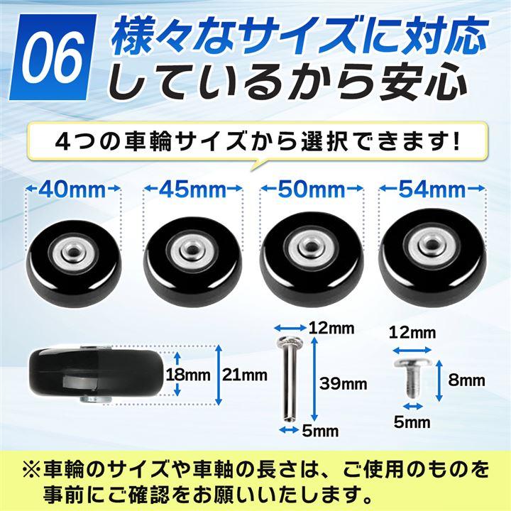 4つの車輪サイズ(40mm、45mm、50mm、54mm)から選択可能だから、幅広いスーツケースに対応。手軽にタイヤ交換し、大切なスーツケースを新たな旅のパートナーにしましょう。