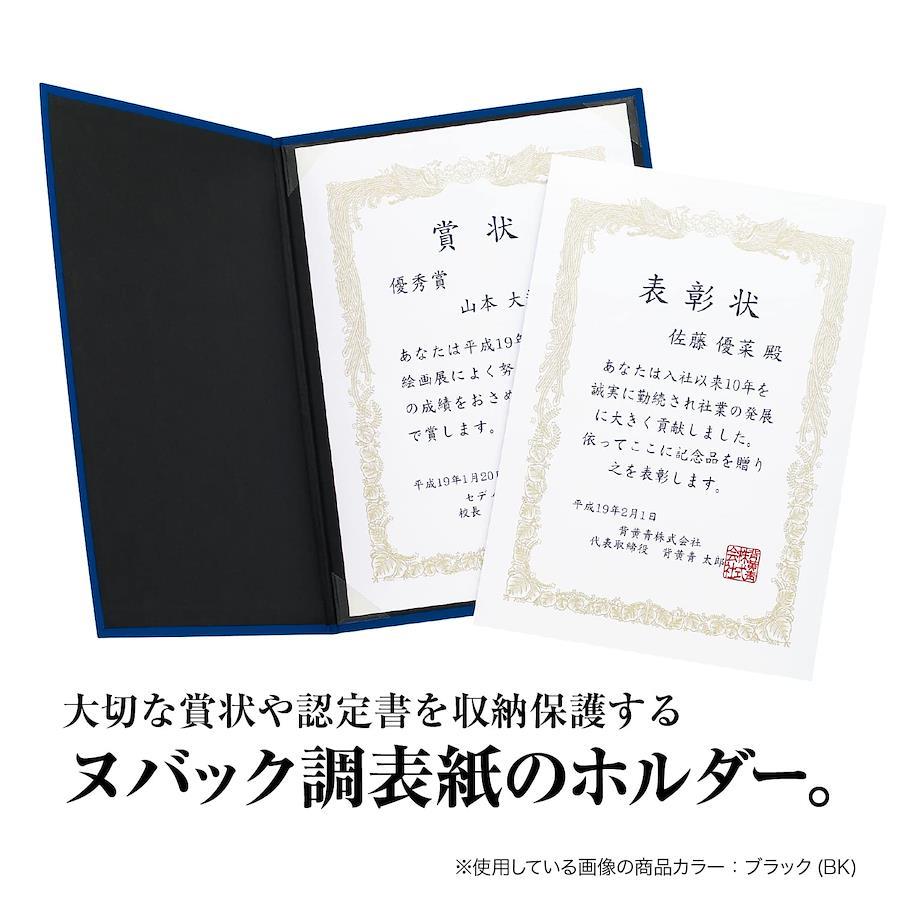 高級感のあるヌバック調の表紙貼り加工。サイズの賞状、認定証などを収納、保存するのに最適です。表彰状や認定書の保存に。辞令の公布に。感謝状の贈呈に。感謝状、表彰状、認定書等を汚れや、痛みから守り、コンパクトに収納できます。ヌバック調の表紙貼り加工で高級感溢れる仕上がりになっています。