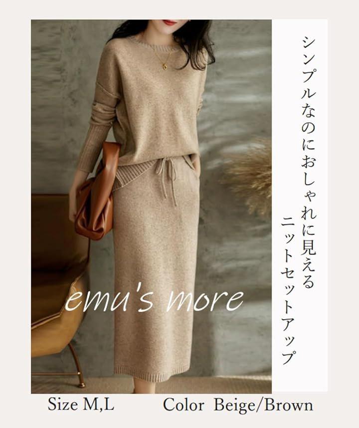 ドロップショルダーデザインの丸首トップスとウエストゴム、ポケット付きのミディアム丈のスカートで、上下セットで着ても別々に着てもお洒落なアイテムとなります。