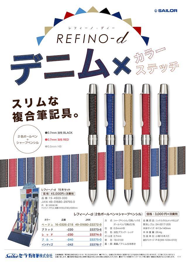 男女を問わず人気の高い「レフィーノ」シリーズ。あらゆる素材と複合筆記具のコラボを実現し続ける「レフィーノ」シリーズにデニム生地とのコラボ筆記具が登場。カラーデニム素材を使用したボディにコーディネートしたステッチがアクセントとなりカジュアルに使える複合筆記具。シャープペンシルと黒・赤のボールペンが使えるので、普段の書きもの、プレゼントを問わずお使いいただける大変便利な筆記具。持つ人に大人の遊び心と余裕を与えてくれるペン。