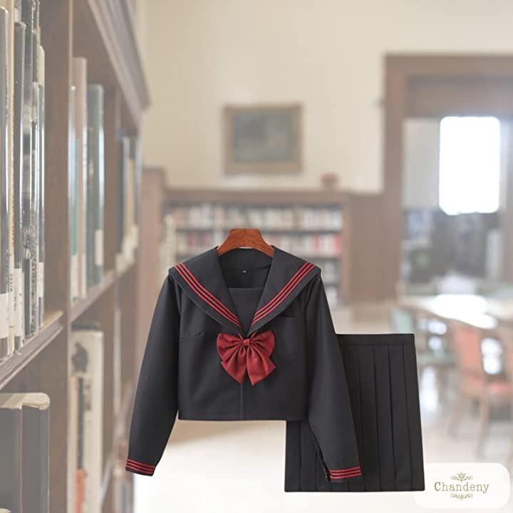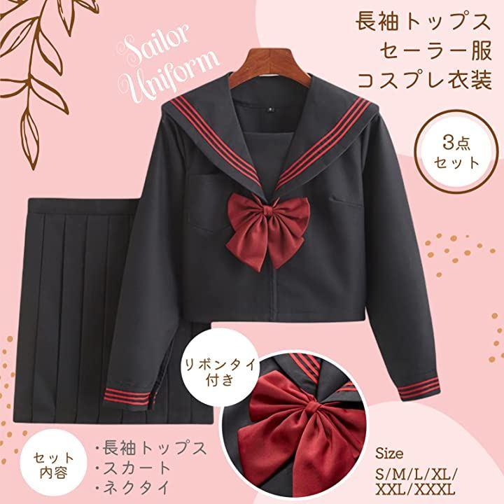 [シャンディニー]セーラー服コスプレ黒長袖大きいサイズJK学生服リボンタイ付き長袖トップスプリーツスカート3点セット