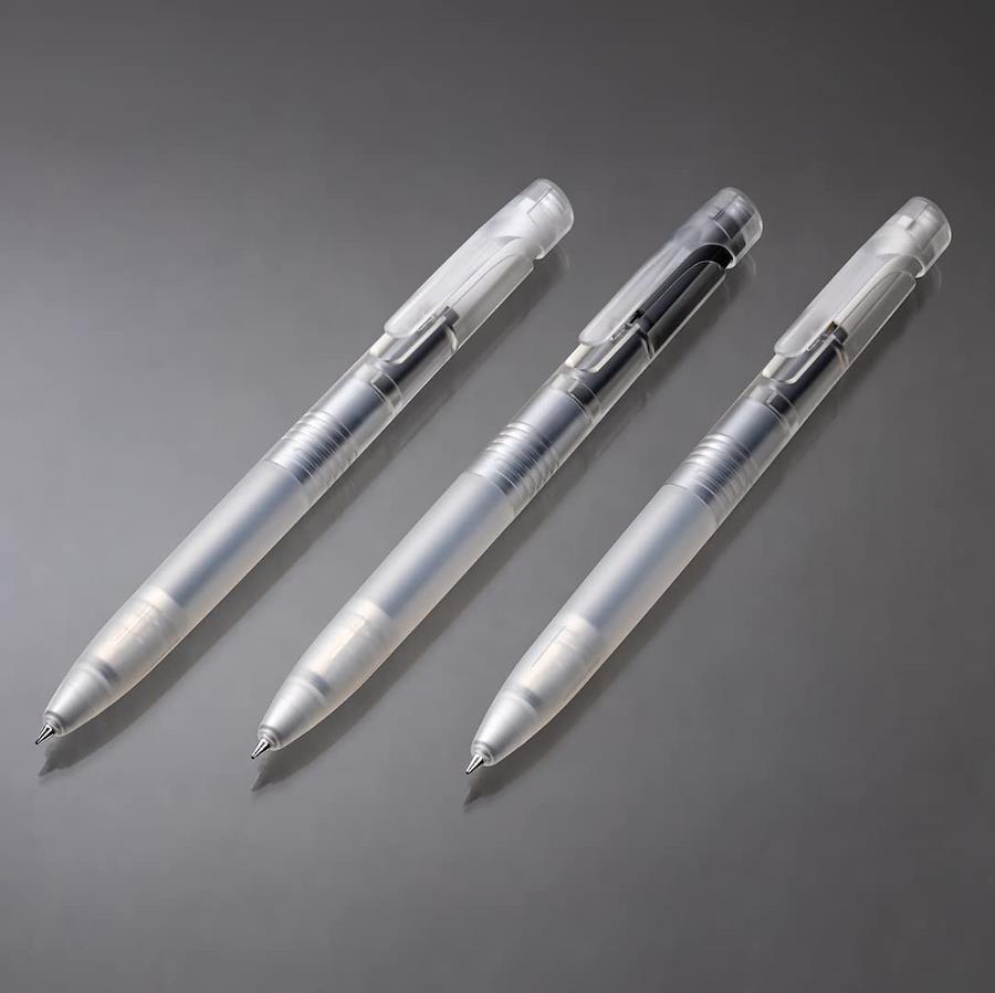 ブレン ファインドメカニズム エマルジョンインクボールペン インク色はすべて黒 ボール径0.5mmのみ 替芯:NC-0.5mm 商品名の由来:筆記が「ブレない」ことによる造語 昔ながらのキャップ式ボールペンに代わり、今主流となっているノック式ボールペンは構造がより複雑になるため、細かく組み合わさった部品の間に隙間が生じることがあり、それが筆記振動となって書き心地に影響していることがありました。 『ブレン』は独自開発の機構によって、従来のボールペンでは筆記時に紙とペン先が接触すると発生していた振動(ブレ)を制御することで、「ストレスフリーな書き心地」を実現した新しいボールペンです。その書き心地の良さやスタイリッシュなデザインで、ストレスなく仕事に取り組みたい社会人を中心に人気となっています。 現在発売している『ブレン』のボディカラーは不透明であったため内部機構が見えないデザインでしたが、『ブレン ファインドメカニズム』はブレンシリーズ初となるクリア素材を採用しました。本体を透明にすることで、書きやすさの秘密“ブレンシステム”を可視化し、視覚からもストレスフリーな書き心地を体感でき
