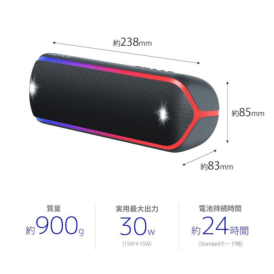 防水対応で、お風呂やキッチンでも音楽を楽しめる。防塵対応かつサビにも強いので、海やアウトドアでも使用できる。IP67に対応。また、5時間の充電でStandardモード時には24時間再生、EXTRABASSモード時には14時間再生ができるバッテリーを内蔵。
