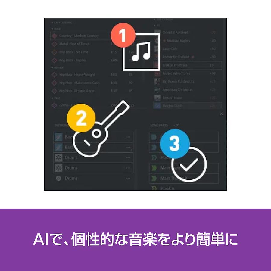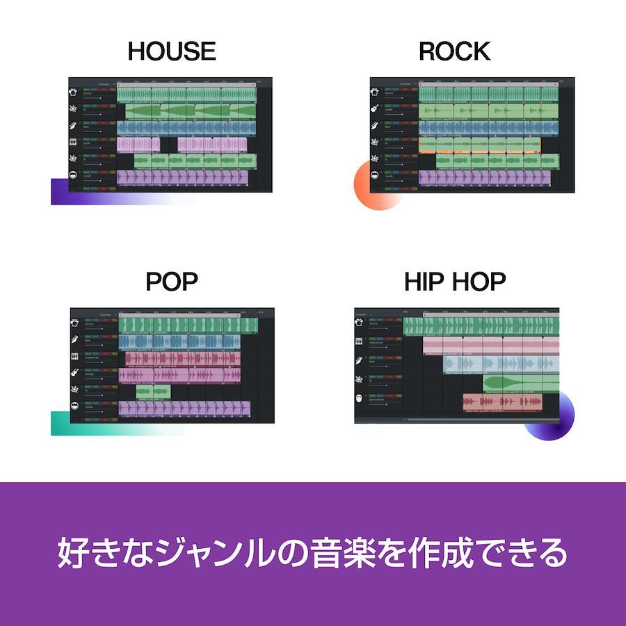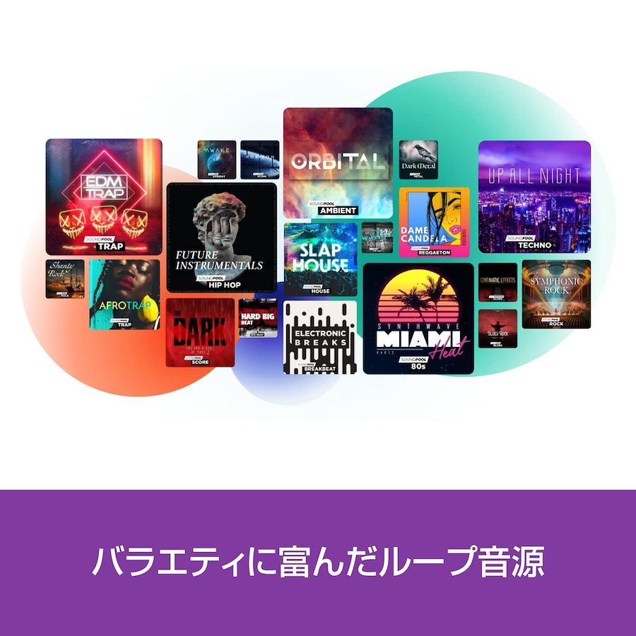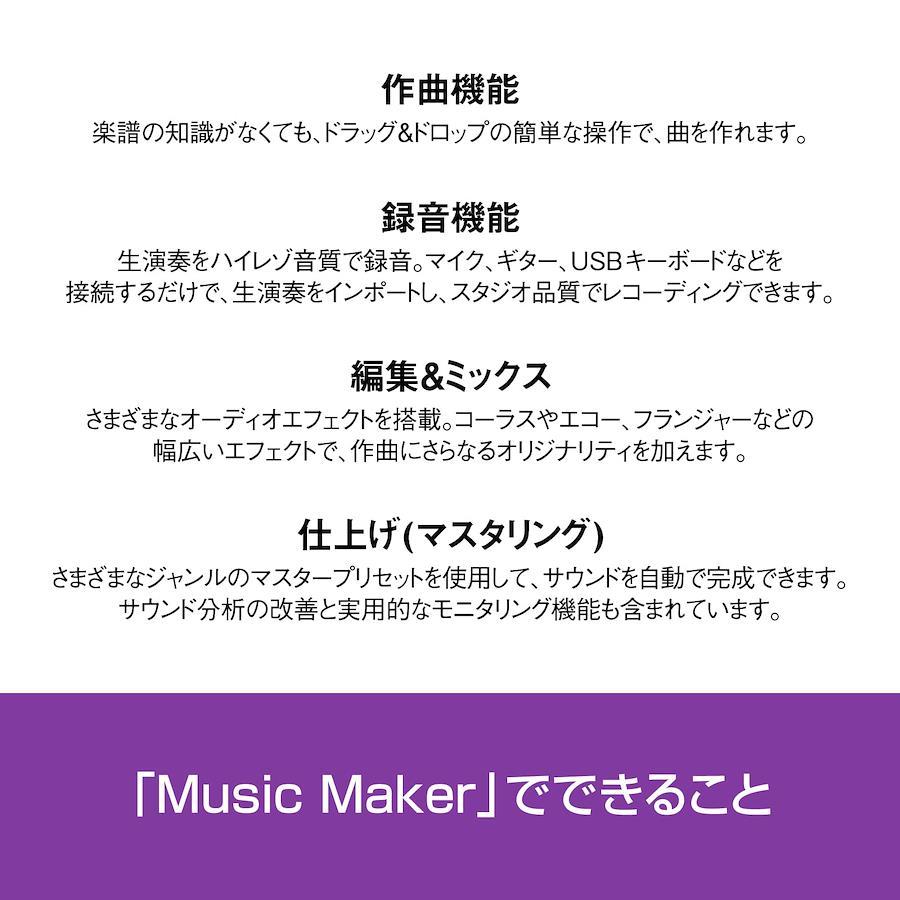 対応OS:Windows 11/10 (64bit)CPU:2GHzmemory:2GBHDD:プログラムのインストール用に1.5GB以上付属のSound Forge Audio Studio 12はWindows8.1,10のみに対応、サウンドループは商用利用不可、インターネット環境が必要「MUSIC MAKER 2023 PREMIUM」は、AIによる自動作曲の機能を搭載した曲作りの総合ソフトです。楽譜の読めない初心者でも曲が作れる一方、 プロフェッショナルのツールとしても愛用されています。 こちらの商品は、シリアル番号とダウンロード手順が記載されたものが同梱されております。(商品発送あり)本製品のご利用にはインターネット環境が必要です。 ポイント1:「MUSIC MAKER 2023 PREMIUM」は、AIによる自動作曲の機能を搭載した曲作りの総合ソフトです。楽譜の読めない初心者でも曲が作れる一方、 プロフェッショナルのツールとしても愛用されています。 ポイント2:簡単な3つのステップで、オリジナル曲を自動で作曲できます。STEP1:テンプレートとサウンドループを選ぶ STEP2:曲のパーツと楽器を追加 STEP3:曲が完成 ポイント3:AIで、個性的な音楽をより簡単に作成。ポップスやヒップホップ、EDMなど49ジャンルのテンプレートから好きなメロディーを選ぶだけで、AIが洗練された音楽を生み出します。 ポイント4:バラエティに富んだループ音源。繰り返し再生してもつながって聞こえる「ループ音源」を、幅広いジャンルで搭載。好みのループ音源を選び、自由に組み合わて作曲を楽しめます。対応OS:Windows 11(64ビット版)、Windows 10(64ビット版)