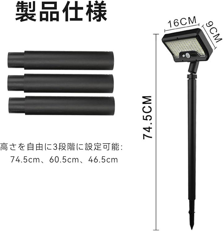 3段階の高さ調節と360°回転可能なランプヘッドで、庭・小道・玄関周りを自由に照らせます。