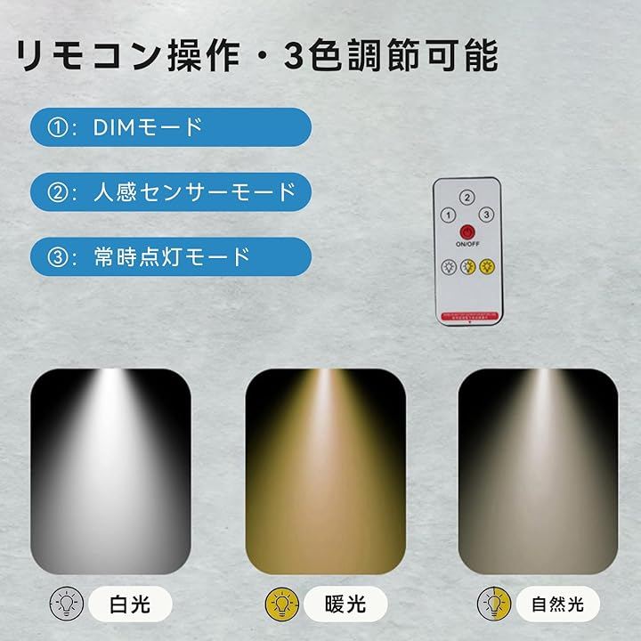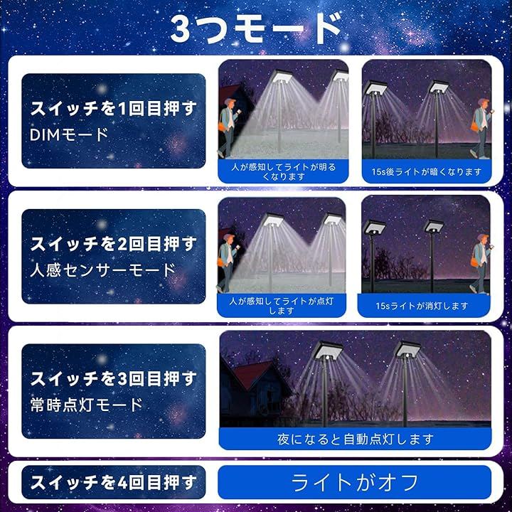 「3モード人感センサー&自動点灯」人感センサーライト屋外専用設計:(1) DIM節電モード:常時微光+人感知>高輝度化 (2) 強光モード:暗闇で動体を感知>高輝度点灯(15秒持続)(3) 常夜灯モード:夜間低光度持続照明 光センサー内蔵で日没自動作動。