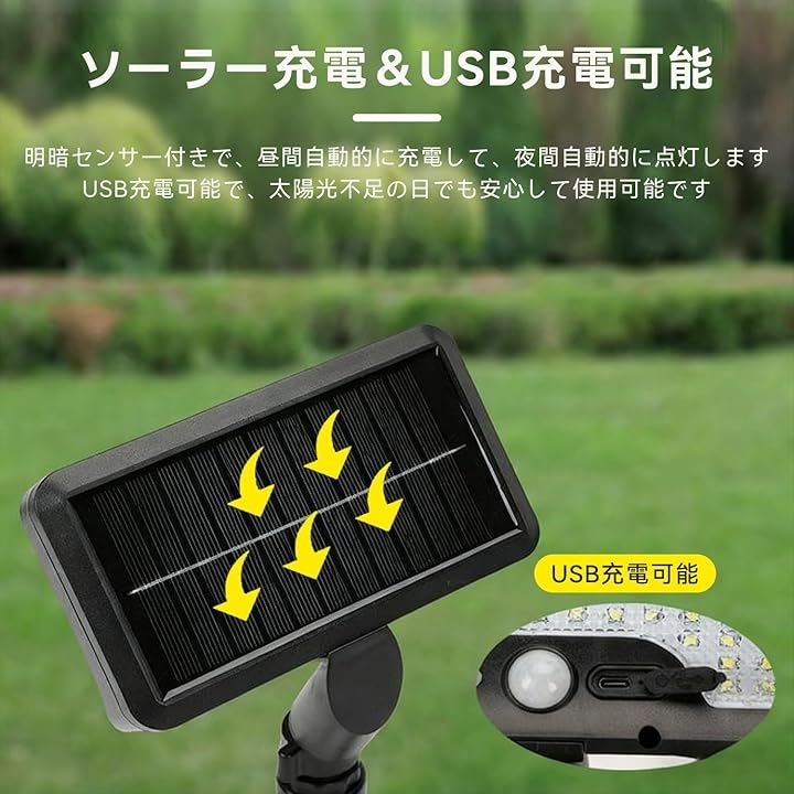「太陽光&USB充電の3色調節ライト」ソーラーライト屋外防水設計で、太陽光発電パネルとUSB充電のデュアル電源対応。